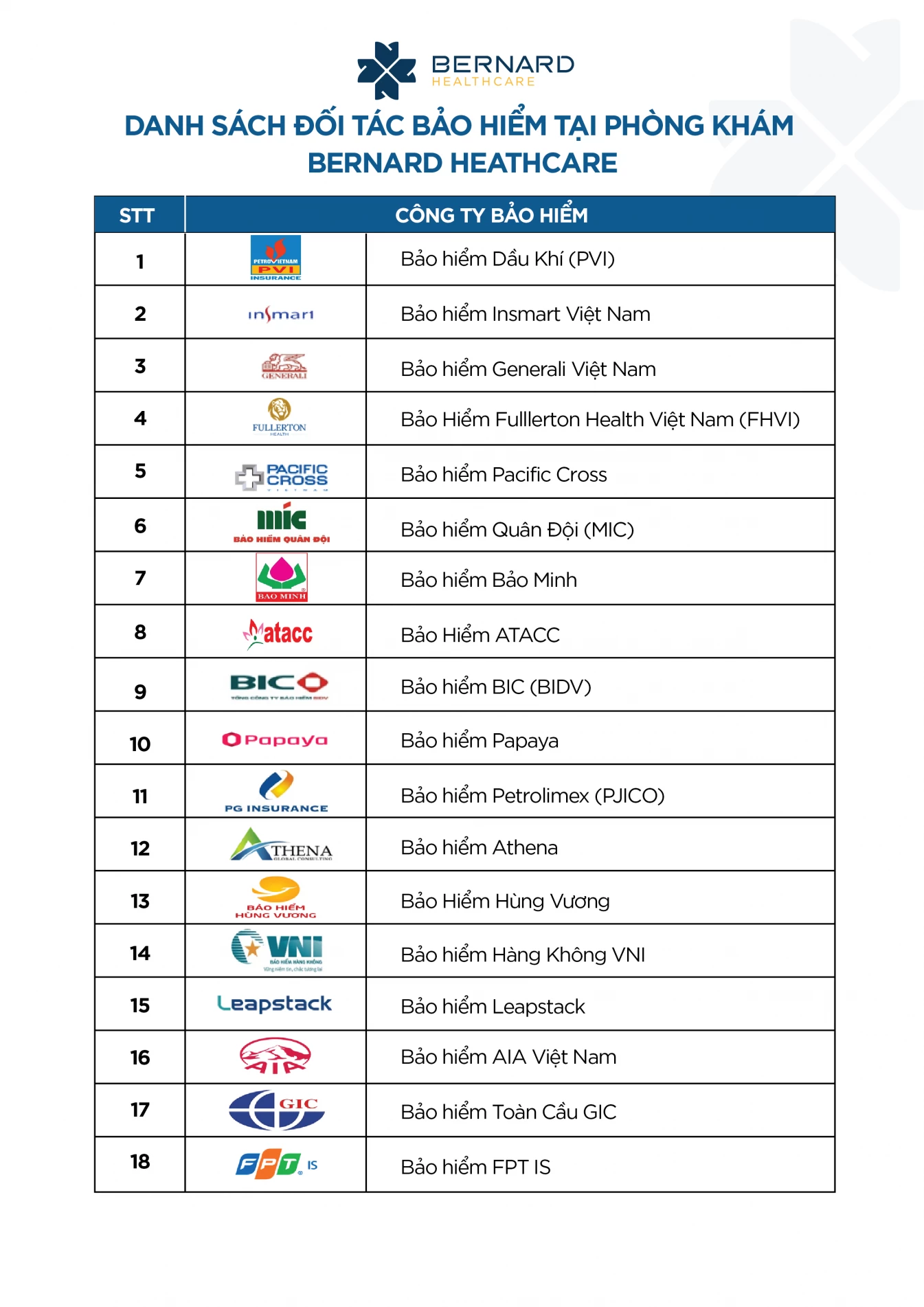 Bernard Healthcare tự hào là đối tác bảo lãnh viện phí của nhiều công ty bảo hiểm uy tín trong nước và quốc tế, mang đến cho khách hàng sự yên tâm và thuận tiện trong việc chăm sóc sức khỏe và thanh toán chi phí điều trị.