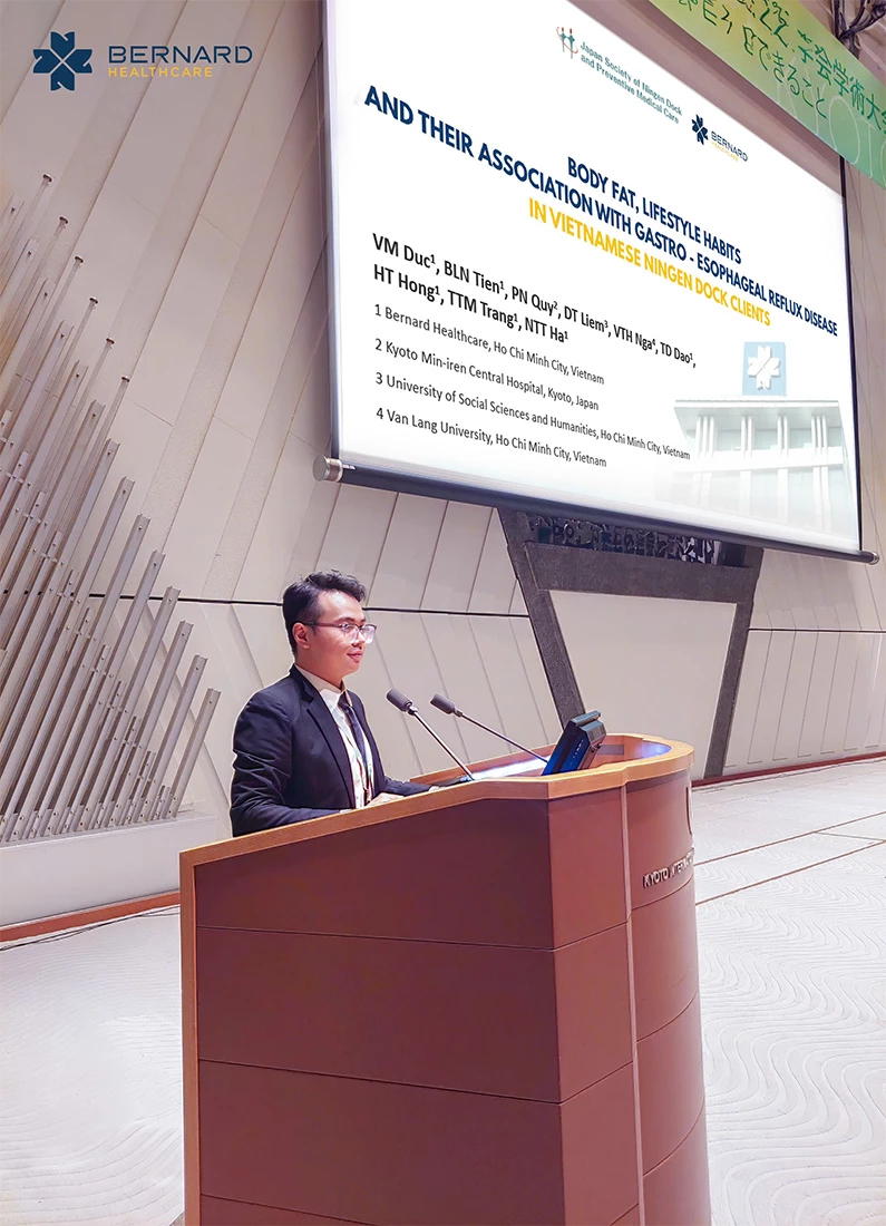 Tại hội nghị năm nay, Bernard Healthcare tiếp tục gây chú ý với hai nghiên cứu nổi bật: Double Reading and Discrepancies in Diagnostic Imaging: A Cross-Sectional Study at Bernard Healthcare and University of Yamanashi Hospital (Tham vấn ý kiến thứ hai trong chẩn đoán hình ảnh - hợp tác Bernard Healthcare và Bệnh viện Đại học Yamanashi) và Body Fat, Lifestyle Habits and Their Association with Gastroesophageal Reflux Disease in Vietnamese Ningen Dock Clients (Tỷ lệ mỡ cơ thể, thói quen lối sống và mối liên quan với bệnh GERD ở khách hàng Ningen Dock Bernard Healthcare).