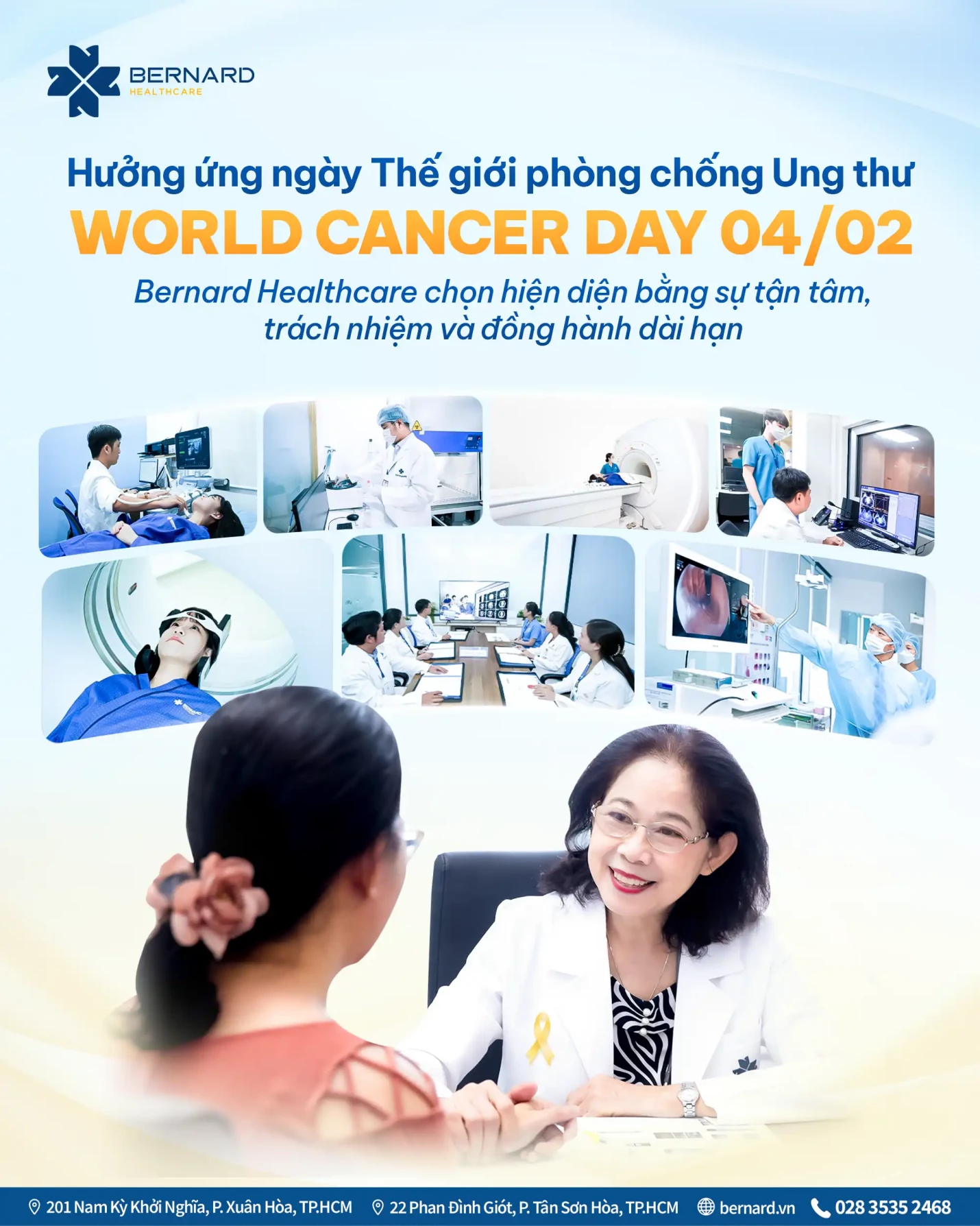 Hưởng ứng ngày Thế giới phòng chống Ung thư - World Cancer Day 04/02/2026, Bernard Healthcare lựa chọn hiện diện bằng sự tận tâm, trách nhiệm và cam kết đồng hành dài hạn, để mỗi người không đơn độc khi đối diện với những quyết định quan trọng liên quan đến sức khỏe của mình.
