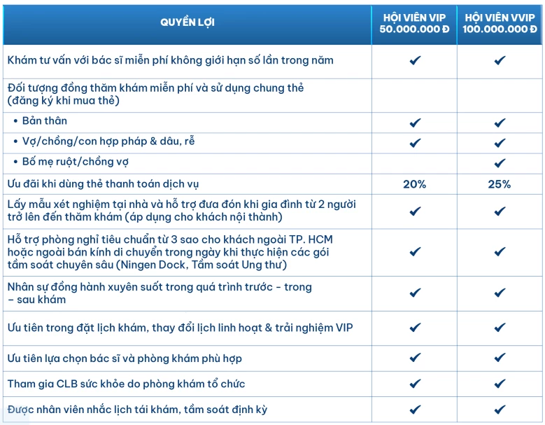 Mỗi hạng hội viên được thiết kế với những quyền lợi phù hợp, giúp khách hàng và gia đình tiếp cận các dịch vụ chăm sóc sức khỏe chuyên sâu một cách thuận tiện hơn.