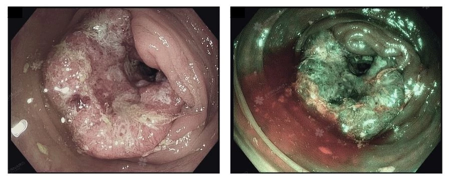 Trong quá trình khảo sát đường tiêu hóa dưới, bác sĩ nội soi Bernard ghi nhận: Có khối u sùi nhiễm cứng, gây hẹp lòng tại đại tràng phải, khiến ống nội soi không thể đi qua. Theo đúng quy trình, tổn thương được sinh thiết và gửi thực hiện giải phẫu bệnh để làm rõ bản chất.