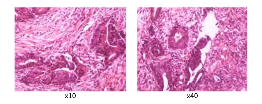 Kết quả giải phẫu tổn thương đại tràng phải cho thấy hình ảnh tân sản tế bào tuyến, nhân dị dạng ái kiềm, tỉ lệ N/C >1, các tế bào xếp thành tuyến không điển hình. Kết luận: Carcinoma tuyến biệt hóa trung bình (ung thư đại tràng).