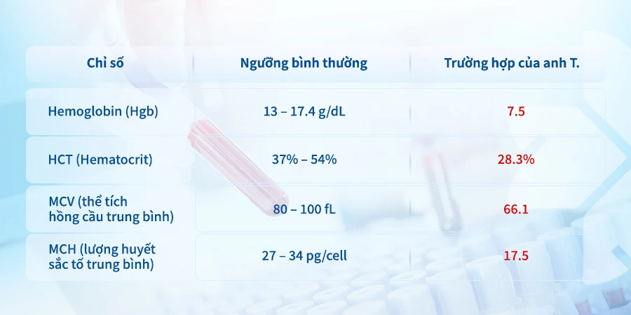 Khi tiếp nhận và phân tích kết quả xét nghiệm, hệ thống cảnh báo cận lâm sàng của Bernard đã lập tức ghi nhận một chỉ số bất thường nghiêm trọng: Hemoglobin (Hgb) chỉ còn 7.5 g/dL, thấp hơn nhiều so với ngưỡng bình thường. Đồng thời, các chỉ số liên quan như HCT (Hematocrit), MCV (thể tích hồng cầu trung bình) và MCH (lượng huyết sắc tố trung bình) đều giảm mạnh, phản ánh tình trạng thiếu máu hồng cầu nhỏ nhược sắc mức độ nặng.