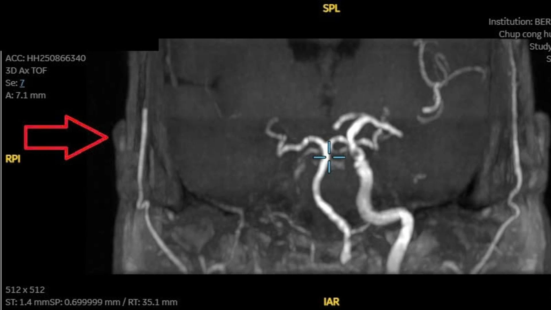 Vấn đề thứ hai là tắc động mạch cảnh trong (P) từ đoạn xương đá thể hiện qua tín hiệu hiệu dòng chảy qua đoạn M1 kém rõ nét. Đây là phát hiện quan trọng, vì tắc động mạch cảnh trong có thể gây đột quỵ thiếu máu não nếu không được theo dõi và xử trí phù hợp.
