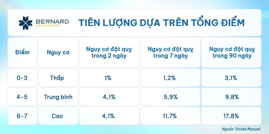 Lưu ý: Bảng điểm trên chỉ mang tính chất tham khảo nguy cơ, nhưng không thể dự đoán chính xác khả năng đột quỵ có thể xảy ra ở người trải qua TIA hay không.
