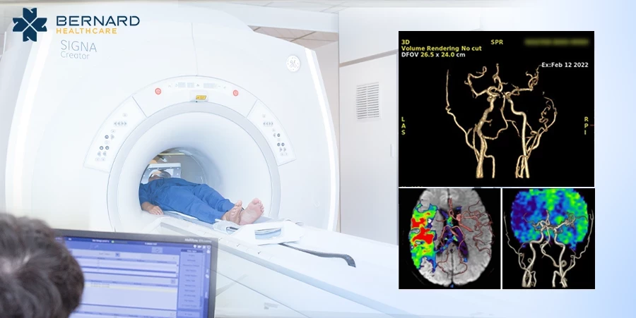 Tại Bernard, chụp cộng hưởng từ sọ não bằng máy MRI 1.5 Tesla SIGNA Creator phiên bản đầy đủ của GE Healthcare (Mỹ), có tích hợp dựng hình 3D mạch máu não và đánh giá tưới máu, giúp phát hiện các yếu tố nguy cơ thầm lặng gây đột quỵ.