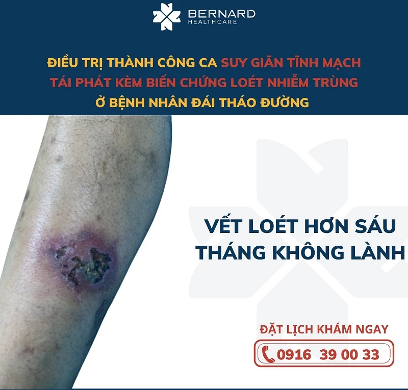 Một bệnh nhân nam, 54 tuổi đã từng điều trị phẫu thuật suy giãn tĩnh mạch tại nước ngoài cách đây khoảng 15 năm đến khám tại Hệ thống Y khoa chuyên sâu Quốc tế Bernard. Triệu chứng lâm sàng ghi nhận loét mặt ngoài cẳng chân trái không lành đã 6-8 tháng, có dấu hiệu nhiễm trùng, kèm triệu chứng chân trái rất mỏi, chân có nhiều nốt thâm đen.