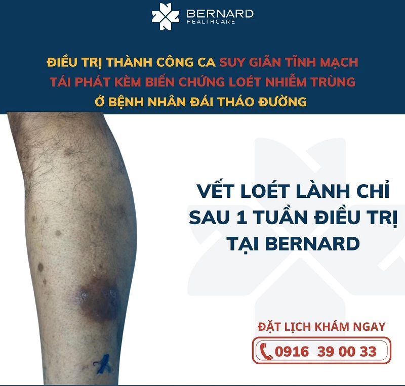 Đơn vị mạch máu – Suy giãn tĩnh mạch Bernard đã tiến hành hội chẩn liên chuyên khoa Nội tiết, Vết thương…dưới sự tham vấn của Hội đồng cố vấn y khoa Bernard Healthcare. Đầu tiên, bệnh nhân đã được Bác sĩ nội tiết điều trị ổn định đường huyết và kháng sinh để tránh tình trạng nhiễm trùng huyết. Sau đó, bác sĩ mạch máu đã tư vấn can thiệp ít xâm lấn suy tĩnh mạch chi dưới bằng kỹ thuật nhiệt nội tĩnh mạch. Hai bước này được thực hiện liên tiếp nhau giúp hiệu quả điều trị được tối ưu nhất.