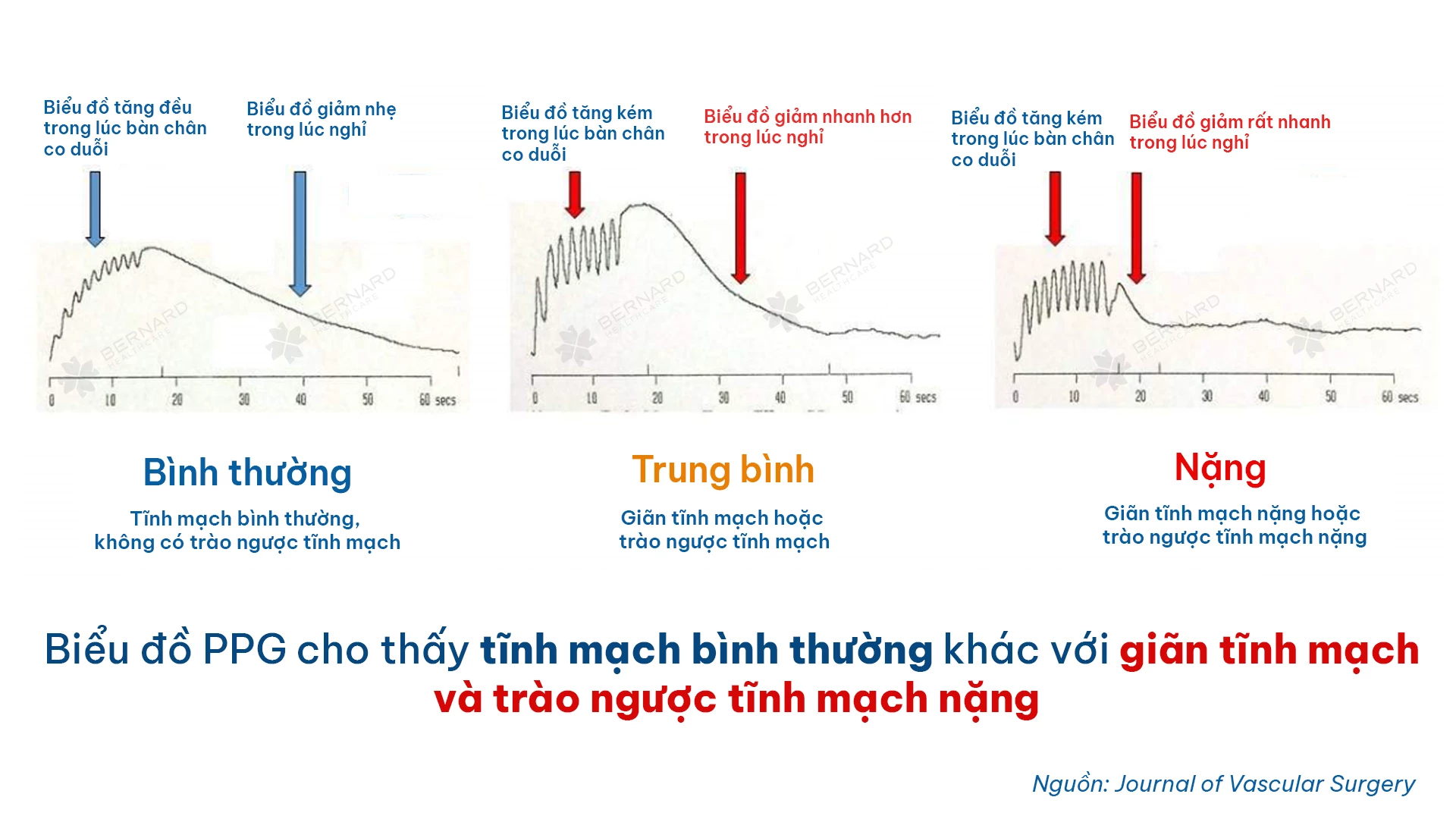 Nhưng ở người bị giãn tĩnh mạch nặng, do van tĩnh mạch bị hỏng nên máu cứ bị trào ngược xuống liên tục. Vì vậy trong lúc co duỗi bàn chân, biểu đồ cũng không tăng nhiều. Lúc nghỉ, máu cũng nhanh chóng dồn xuống chân, làm biểu đồ giảm rất nhanh. Biểu đồ càng giảm nhanh, suy giãn tĩnh mạch, trào ngược tĩnh mạch càng nặng.
