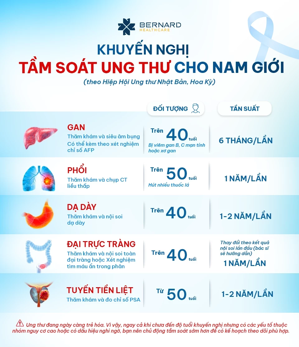 Tầm soát ung thư định kỳ là chìa khóa để phát hiện sớm và cải thiện hiệu quả điều trị, đặc biệt với các loại ung thư phổ biến ở nam giới. Theo khuyến nghị từ Hiệp hội Ung thư Nhật Bản và Hoa Kỳ, dưới đây là những hướng dẫn tầm soát cho các loại ung thư thường gặp.