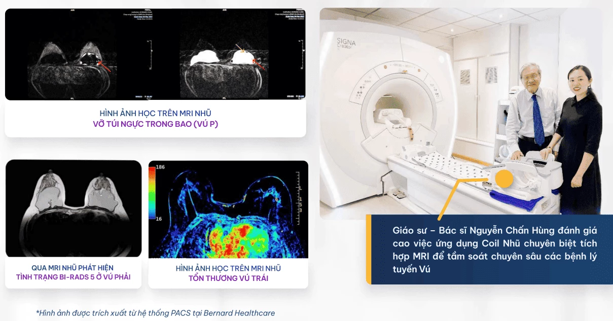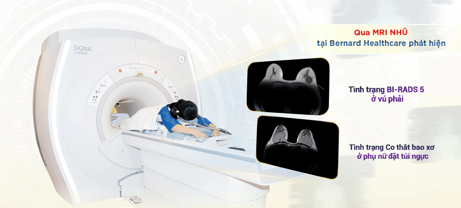 MRI với COIL nhũ chuyên biệt không gây đau, không chèn ép ngực, không dùng tia X chuyên biệt trong chẩn đoán và đánh giá giai đoạn ung thư vú, đặc biệt an toàn cho phụ nữ đặt túi ngực. Quá trình tầm soát diễn ra êm ái, thuận tiện mà vẫn có thể phát hiện sớm các bất thường chỉ vài milimet hoặc ẩn sâu sau lớp túi ngực.