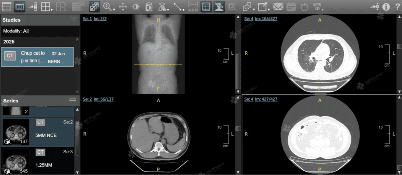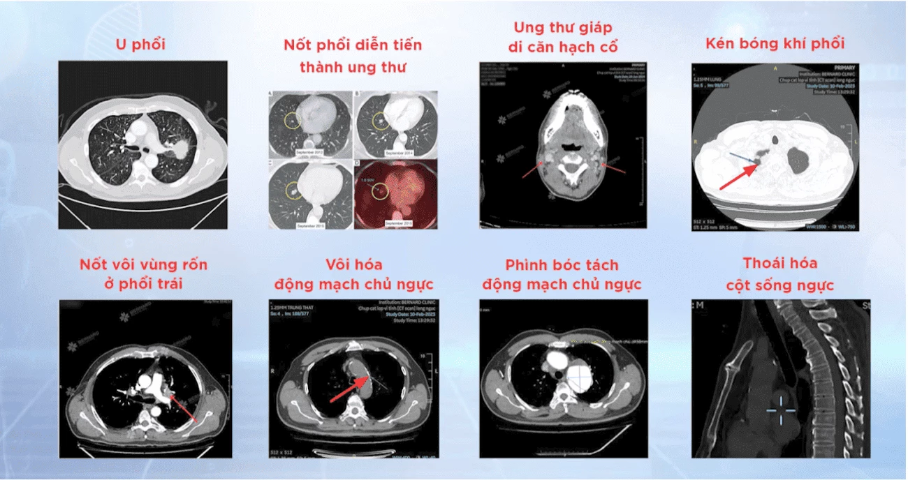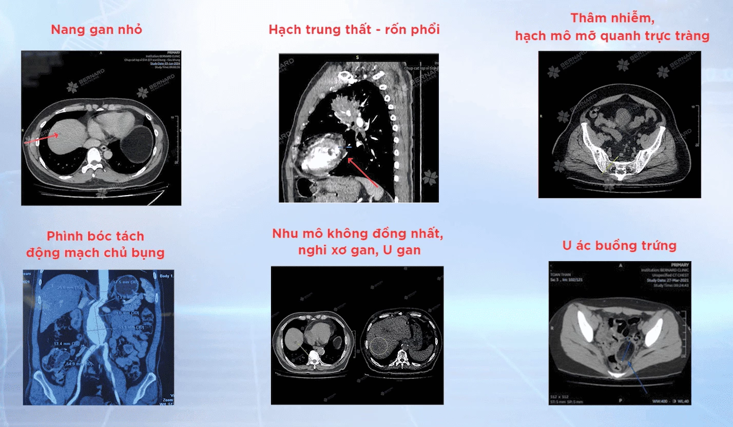 CT scan với khả năng tái tạo bộ phận, mô, xương trong cơ thể thông qua hình ảnh các lát cắt hoặc mặt cắt ngang của cơ thể cơ thể người chi tiết và chính xác, hỗ trợ bác sĩ phát hiện sớm các tổn thương dù rất nhỏ trong phổi mà các phương pháp như chụp X-quang không thể nhìn thấyHình ảnh học từ CT toàn thân giúp bác sĩ quan sát rõ tổn thương bên trong cơ thể mà mắt thường hay khám lâm sàng không thể thấy đượcHệ thống CT Scan được Bernard tận dụng triệt để trong tầm soát và phát hiện sớm các tổn thương lành tính; Tổn thương tiền ung thư (phổi, gan, vú, giáp, cổ tử cung, dạ dày, đại trực tràng,...); Ung thư giai đoạn sớm và ung thư (trích xuất từ hệ thống PACS tại Bernard)