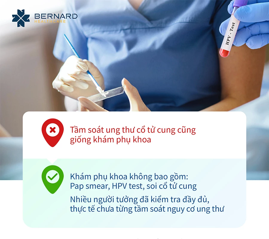 Trong khi đó, tầm soát ung thư cổ tử cung bao gồm các xét nghiệm chuyên biệt như Pap smear (xét nghiệm tế bào cổ tử cung) và HPV test (xét nghiệm virus gây ung thư cổ tử cung). Những xét nghiệm này giúp phát hiện sớm các tế bào bất thường có nguy cơ tiến triển thành ung thư, ngay cả khi chưa có triệu chứng rõ ràng.