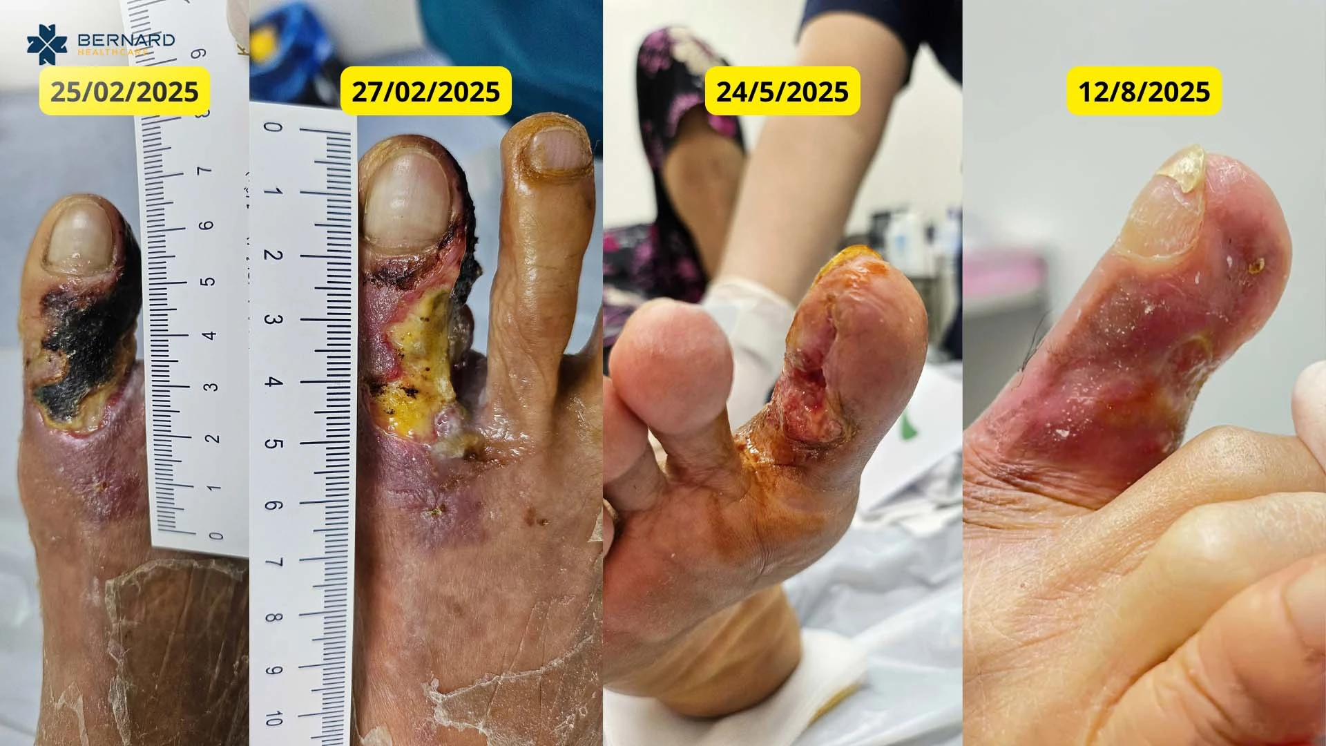 Tại Trung tâm Điều trị vết thương chuyên sâu Bernard, sau khi BS.CK2 Trần Đoàn Đạo trực tiếp thăm khám, ghi nhận ngón chân của bà N. có vết loét hoại tử nửa ngón, tiết dịch mủ vàng, mùi hôi, đau nhức, đi lại hạn chế. Bệnh nhân được chẩn đoán loét bàn chân đái tháo đường, viêm xương.