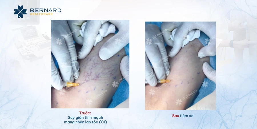 - Nhanh chóng và hiệu quả: Thời gian thực hiện thủ thuật chỉ từ 10-30 phút, giúp xử lý các tổn thương tĩnh mạch khu trú và có thể thấy ngay cải thiện sau khi tiêm.