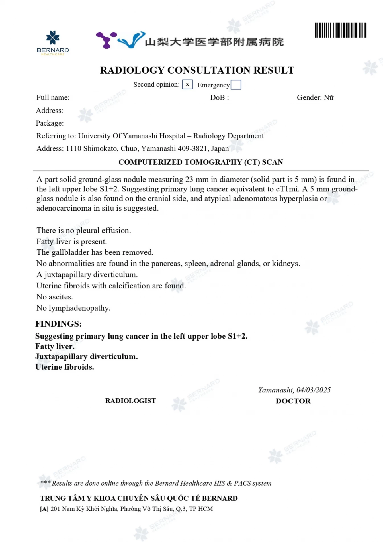 Trong khuôn khổ gói khám, toàn bộ hình ảnh CT Scan phổi của chị D. được gửi tham vấn ý kiến thứ hai tới các chuyên gia chẩn đoán hình ảnh của Bệnh viện Đại học Yamanashi (Nhật Bản) - Đối tác lớn của Bernard cùng vận hành Ningen Dock và 100% đọc chéo/tham vấn ý kiến thứ hai MRI/CT Scan trong gói khám.