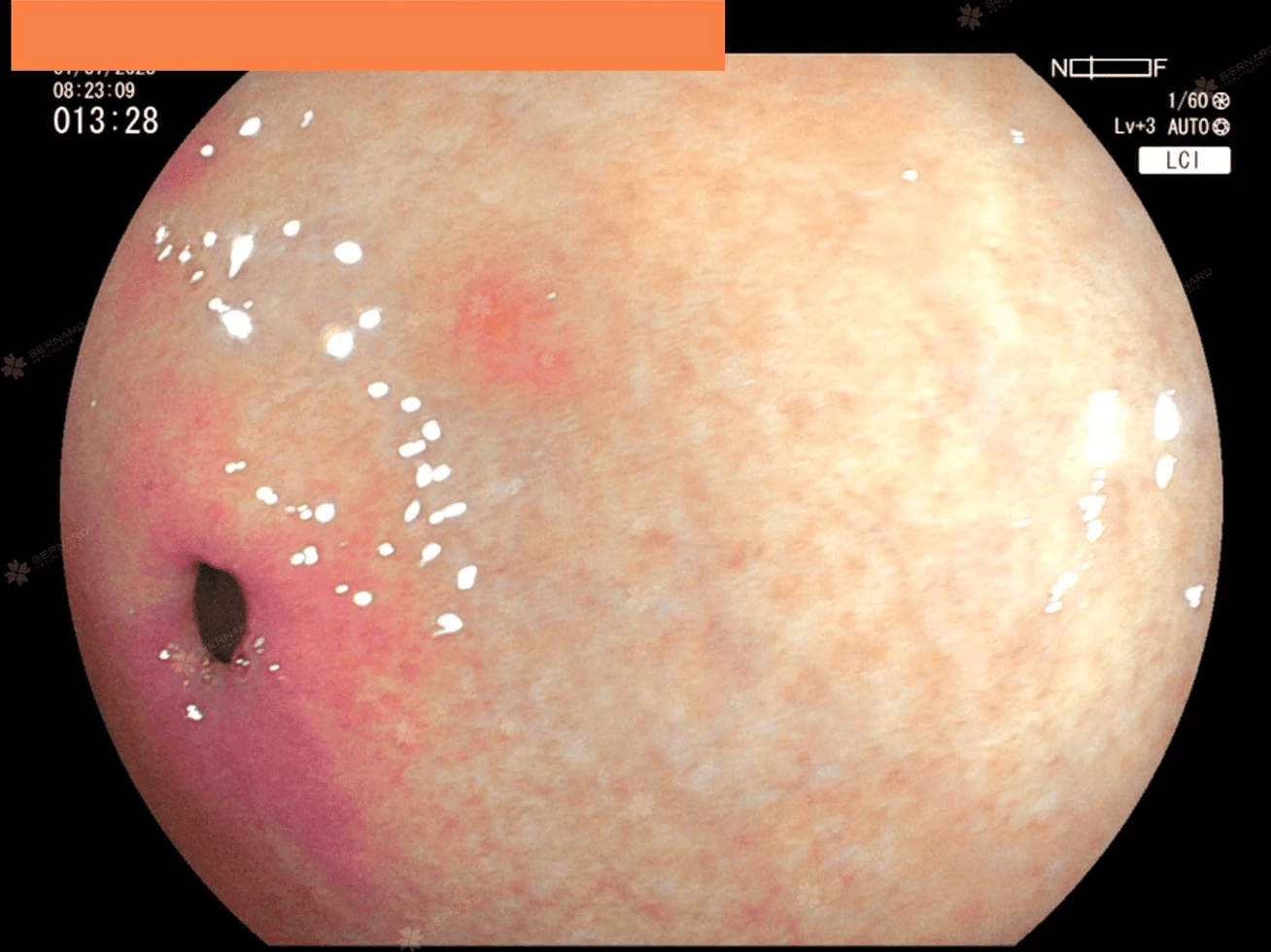 Ở lần nội soi tiêu hóa này, kết quả ghi nhận các tổn thương ở bệnh nhân như Viêm thực quản trào ngược (GERD) độ A, Barrett thực quản, phân độ Prague C1M2. Ngoài ra, bác sĩ Bernard còn ghi nhận tình trạng Viêm teo niêm mạc dạ dày (C1 – theo Kimura Takemoto) kết hợp chuyển sản ruột dạng nhô cao vùng hang vị – tiền môn vị, CLO test (-) (âm tính với vi khuẩn H. pylori). Đây được xem là những tổn thương tiền ung thư dạ dày nhưng ở mức độ nguy cơ thấp.