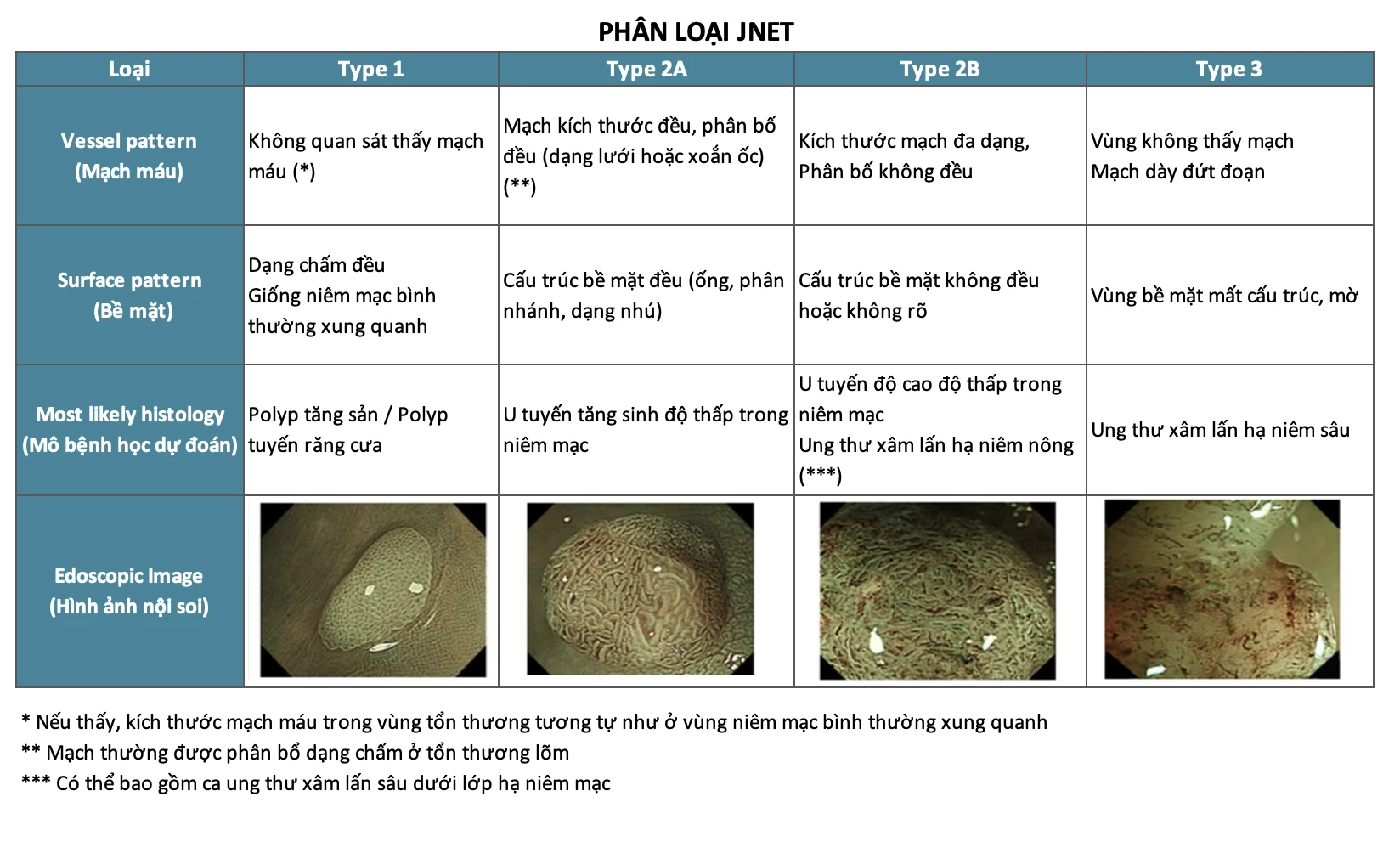 Trong thực hành nội soi hiện đại, yêu cầu này được đáp ứng thông qua phân loại JNET (Japan NBI Expert Team) – một hệ thống đánh giá hình ảnh nội soi tiên tiến, hiện chỉ có thể áp dụng tại các cơ sở y tế được trang bị công nghệ nội soi quang học thế hệ mới và đội ngũ bác sĩ được đào tạo chuyên sâu.
