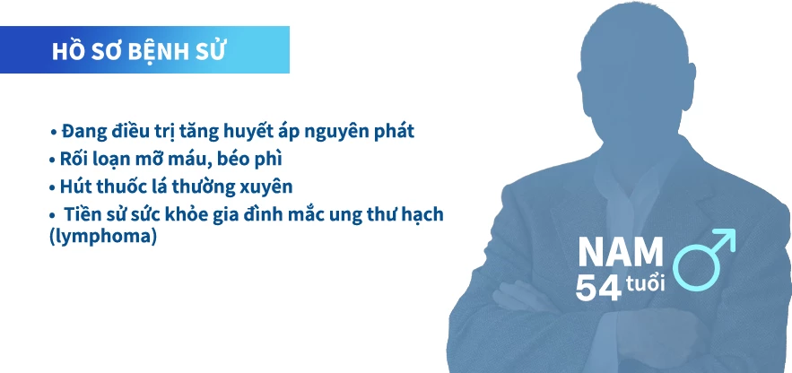 Mặc dù sức khỏe tổng quát ổn định, nhưng anh H. chia sẻ rằng bản thân thường xuyên cảm thấy hồi hộp, khó thở, tim đập nhanh khi gắng sức. Anh đang điều trị tăng huyết áp nguyên phát, có rối loạn mỡ máu, béo phì (cân nặng 84kg) và có thói quen hút thuốc. Ngoài ra, gia đình có tiền sử từng mắc ung thư hạch (lymphoma).
