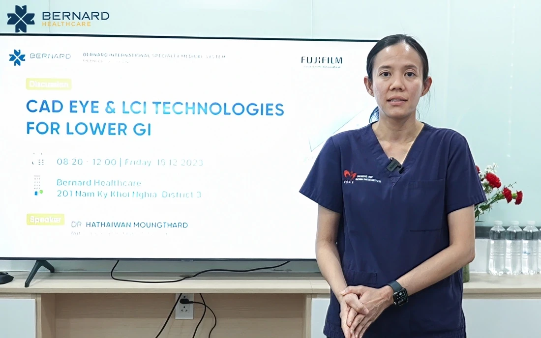 Trước đó, trong buổi giao lưu khoa học "Ứng dụng công nghệ LCI và trí thông minh nhân tạo CAD EYE cho đường tiêu hóa dưới” diễn ra tại Bernard Healthcare vào tháng 12/2023, TS. BS. Hathaiwan Moungthard - Viện ung thư quốc gia Thái Lan (NCI) cũng nhấn mạnh: “Phương pháp nội soi sẽ giúp bác sĩ quyết định hướng xử trí tiếp theo, có thể thực hiện điều trị ngay trong quá trình nội soi như loại bỏ tổn thương nghi ngờ. Hoặc bác sĩ có thể sinh thiết lấy mẫu để chẩn đoán chính xác hơn và đưa ra quyết định phẫu thuật. Như vậy, nội soi không chỉ hỗ trợ tầm soát, chẩn đoán và phát hiện sớm mà còn cả trong việc điều trị cho bệnh nhân”.