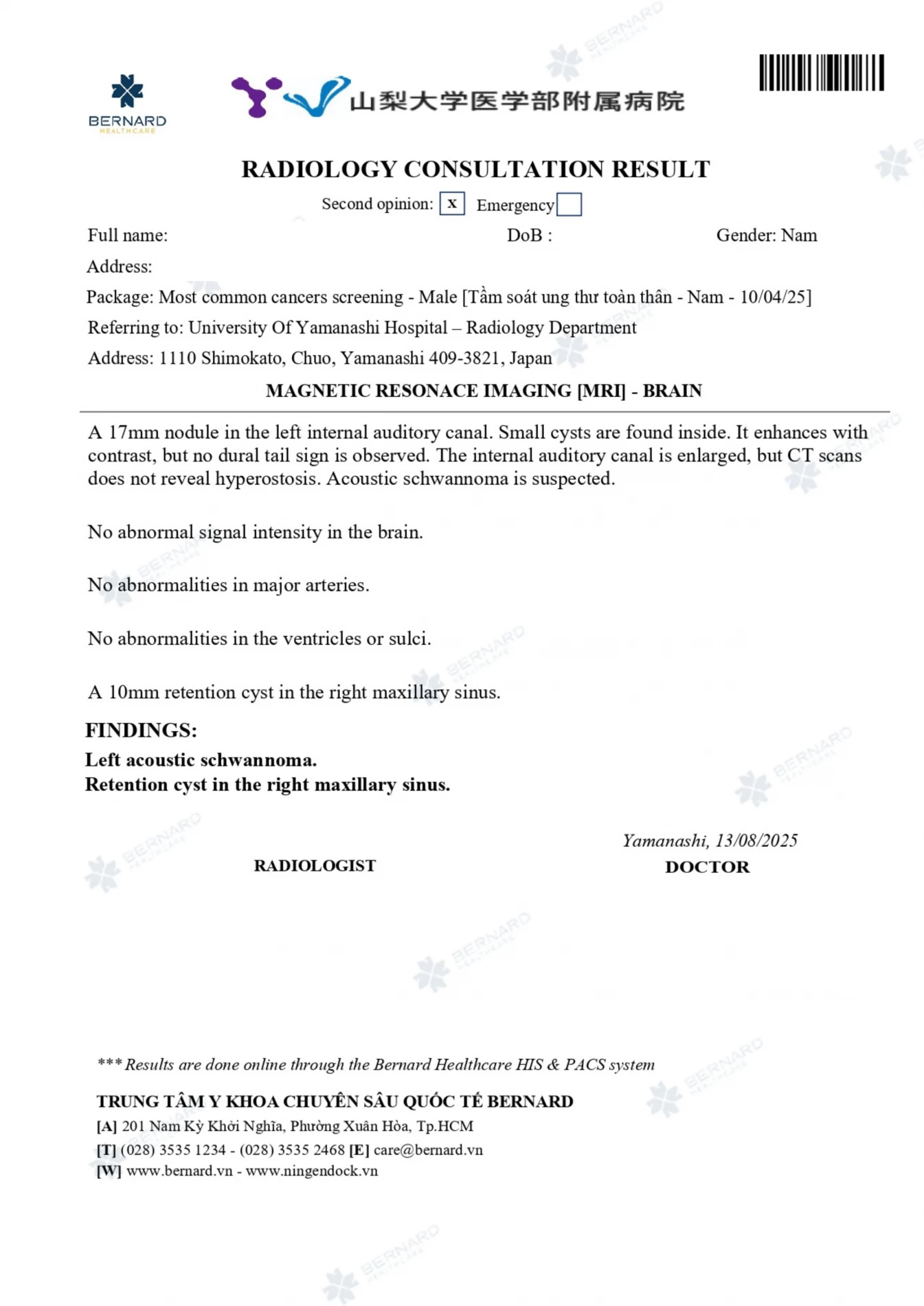 Phát hiện tổn thương nghi u ở vùng góc cầu tiểu não qua tầm soát chuyên sâu ung thư chuẩn Nhật tại Bernard