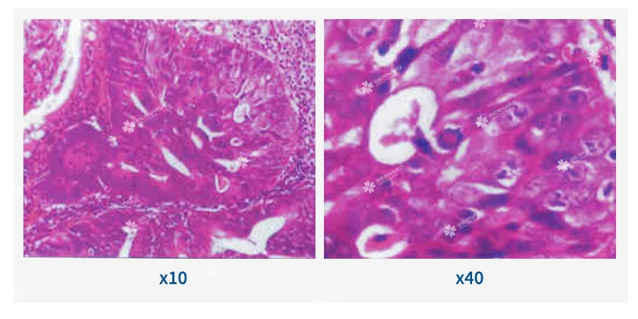 Mẫu sinh thiết lấy ngay trong lúc nội soi nhanh chóng được gửi đi giải phẫu bệnh. Kết quả ghi nhận hình ảnh tân sản tế bào tuyến, nhân dị dạng ái kiềm, tỉ lệ N/C > 1, các tế bào xếp thành tuyến không điển hình, xác nhận tổn thương tại trực tràng là ung thư, dạng Carcinoma tuyến biệt hóa trung bình.