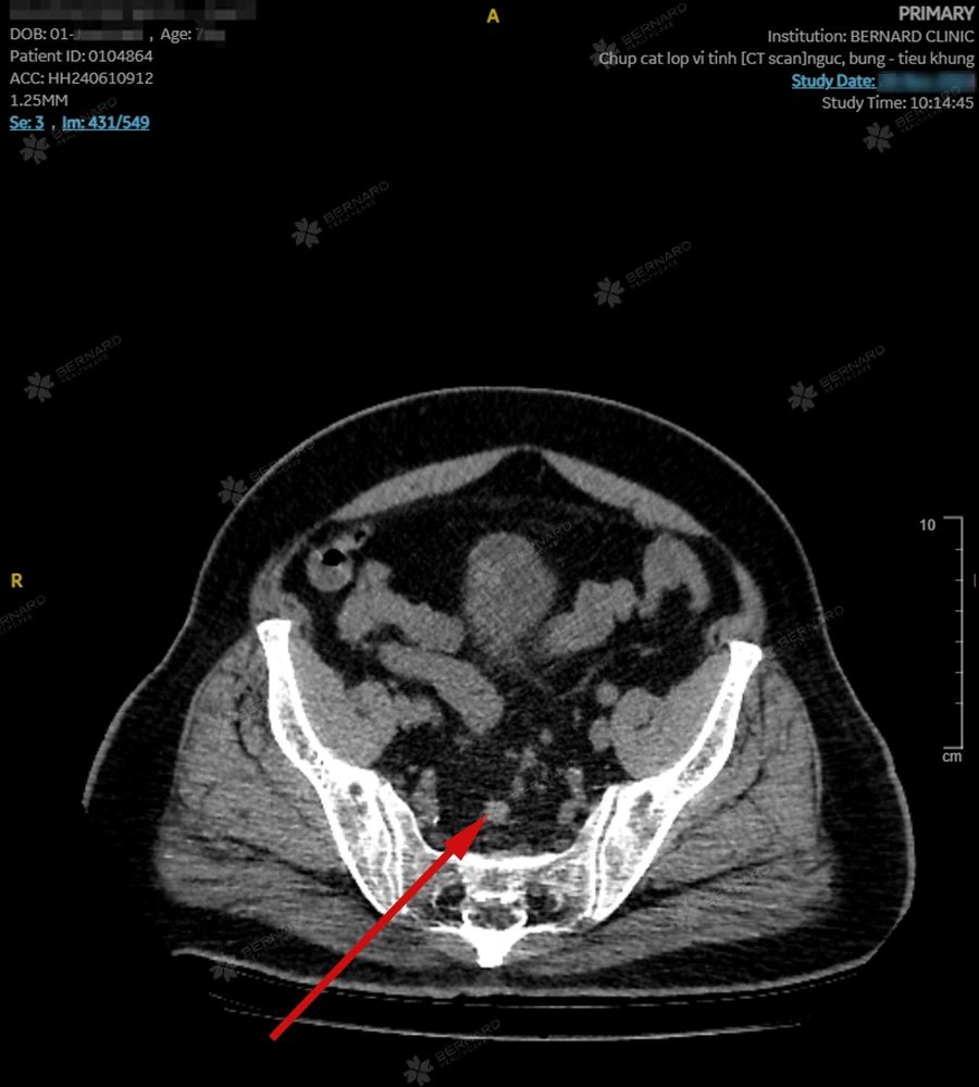 Ngoài ra, bệnh nhân còn thực hiện CT Scan vùng bụng - tiểu khung. Kết quả lớp cắt ghi nhận: Dày không đều thành trực tràng giữa-cao, dmax # 1.6cm, kéo dài một đoạn # 5cm, hình ảnh thể hiện dấu hiệu thâm nhiễm, kèm vài hạch nhỏ mô mỡ quanh trực tràng, dmax # 7mm.
