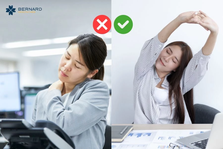 - Tập các động tác giãn cơ đơn giản ngay tại bàn: xoay cổ tay, xoay vai, gập - duỗi chân, vươn người,...