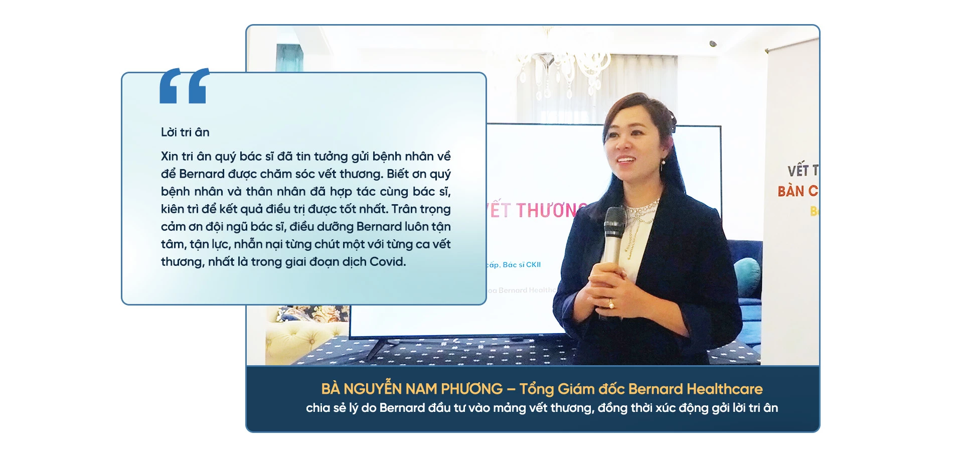 Bernard phát triển bất cứ chuyên khoa nào cũng dựa trên ba giá trị cốt lõi này, trong đó mảng vết thương là mảng tâm huyết của Bernard" - bà Nguyễn Nam Phương, tổng giám đốc Bernard Healthcare, chia sẻ tại buổi lễ.