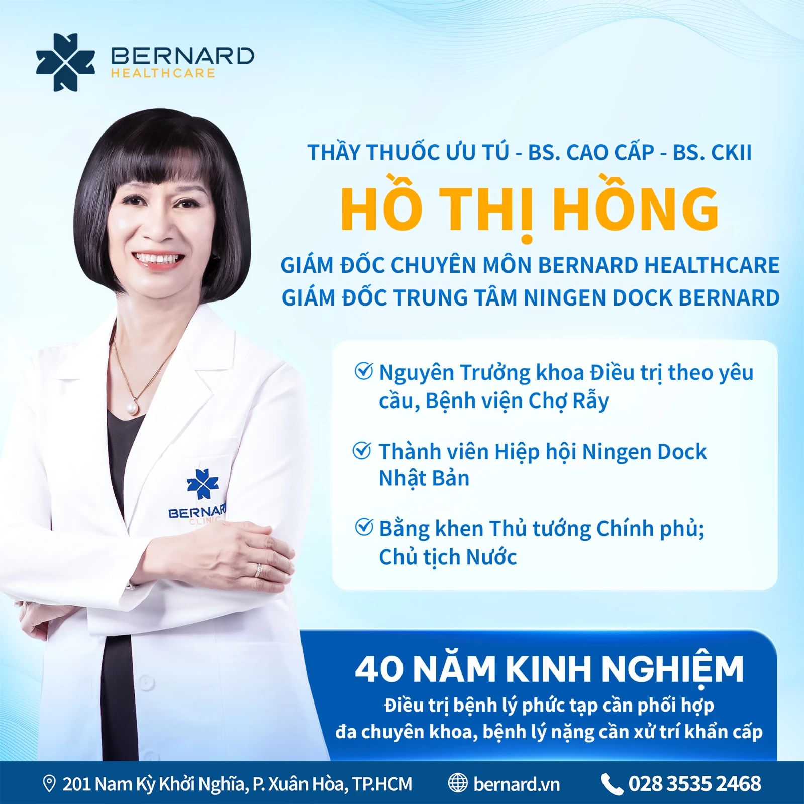 Để thăm khám và tầm soát sức khỏe chuyên sâu với Thầy thuốc Ưu tú - BS CKII. Hồ Thị Hồng, bạn đọc liên hệ Trung tâm Ningen Dock - Hệ thống Y khoa Chuyên sâu Quốc tế Bernard qua hotline: (028) 3535 2468 hoặc nhận tư vấn NGAY TẠI ĐÂY.