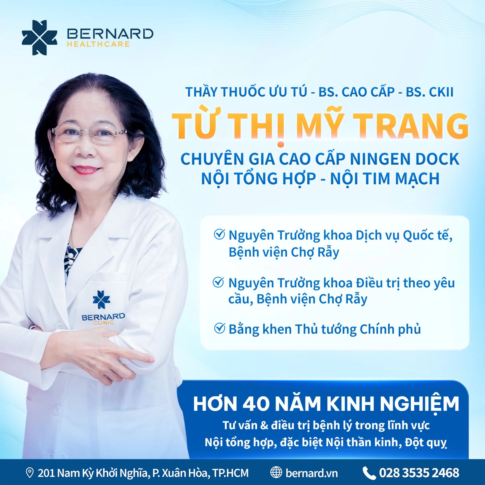 Để thăm khám và tầm soát sức khỏe chuyên sâu với Thầy thuốc Ưu tú - BS CKII. Từ Thị Mỹ Trang, bạn đọc liên hệ Trung tâm Ningen Dock - Hệ thống Y khoa Chuyên sâu Quốc tế Bernard qua hotline: (028) 3535 2468 hoặc nhận tư vấn NGAY TẠI ĐÂY.