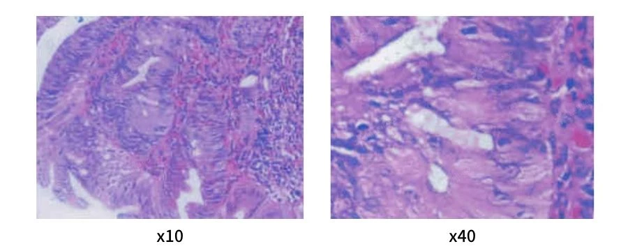 Kết quả sinh thiết cho thấy tân sản tuyến với đặc điểm nhân tăng sắc kiềm, hạt nhân lớn, có hình ảnh nhân chia không điển hình. Tế bào sắp xếp thành cấu trúc tuyến ống và nhánh, có hiện tượng xâm nhập tế bào viêm.