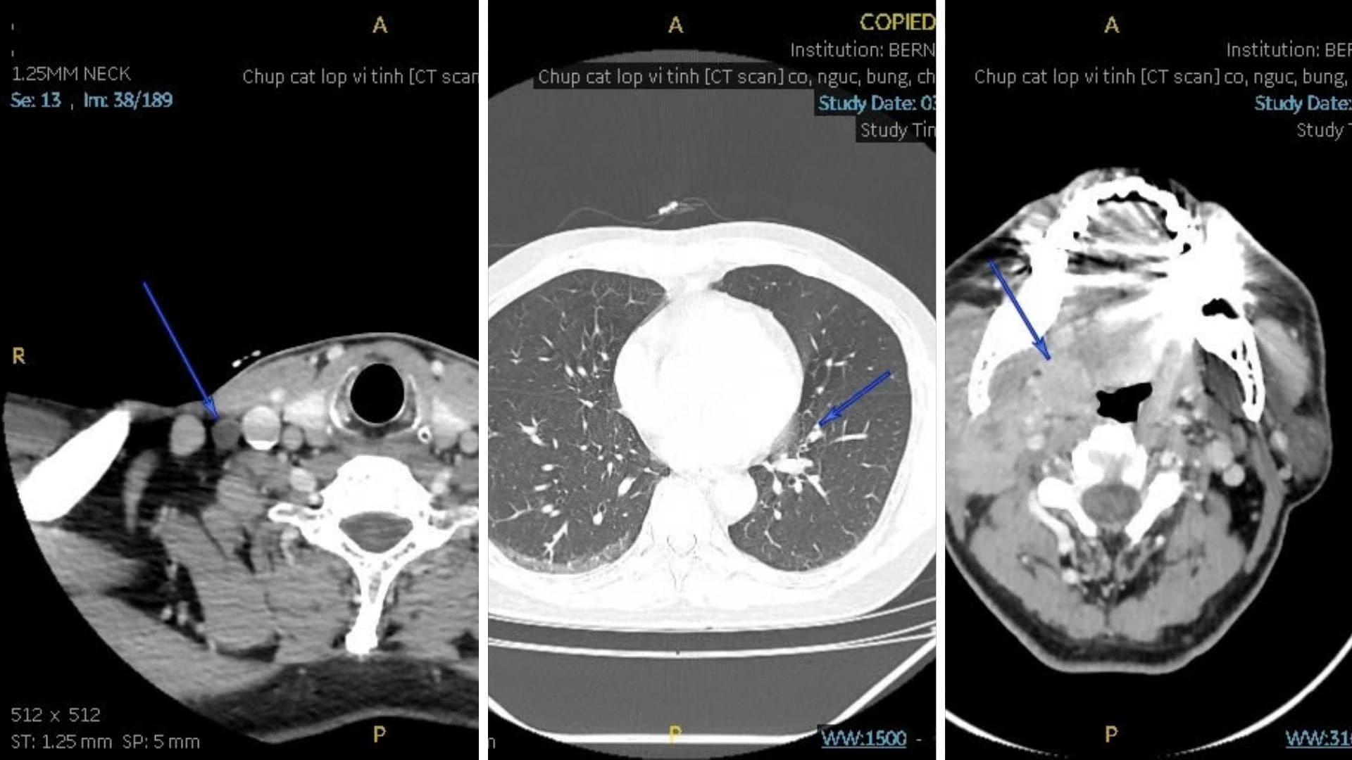 Trên cơ sở đó, bệnh nhân được chỉ định chụp CT Scan cổ - ngực - bụng - chậu nhằm đánh giá toàn diện khả năng di căn và xác định mức độ tiến triển của bệnh.