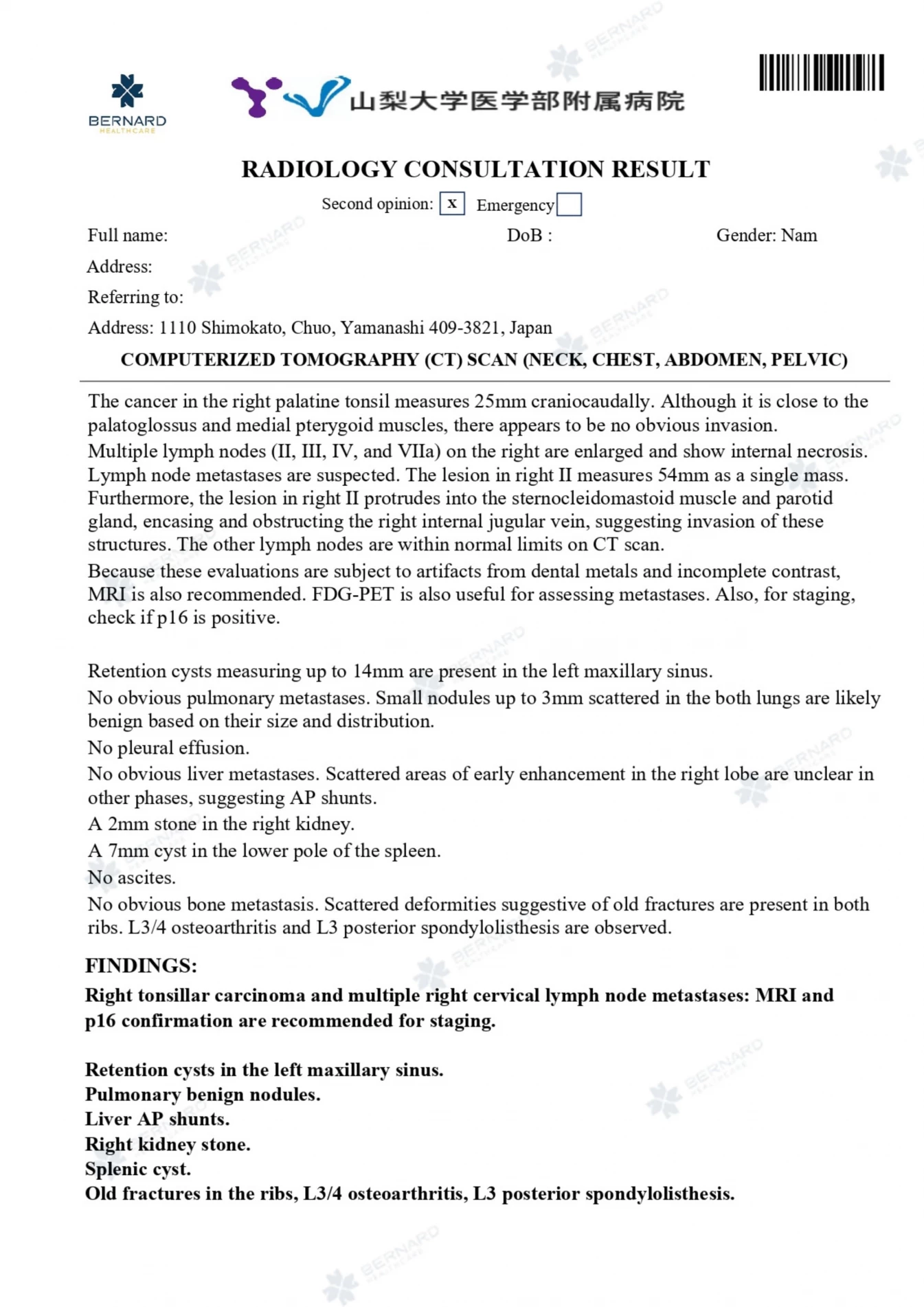 Đánh giá từ chuyên gia Nhật Bản đồng ý rằng đây là ung thư amidan phải và di căn nhiều hạch cổ phải. Bệnh nhân được khuyến cáo thực hiện MRI vùng cổ để đánh giá rõ ràng hơn mức độ xâm lấn mô mềm và chụp FDG-PET để đánh giá phạm vi di căn.