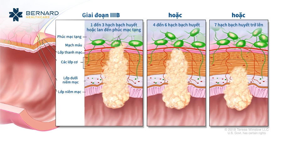 - Giai đoạn IIIB: Xâm lấn thành ruột hoặc các cơ quan lân cận và di căn đến một vài hạch.