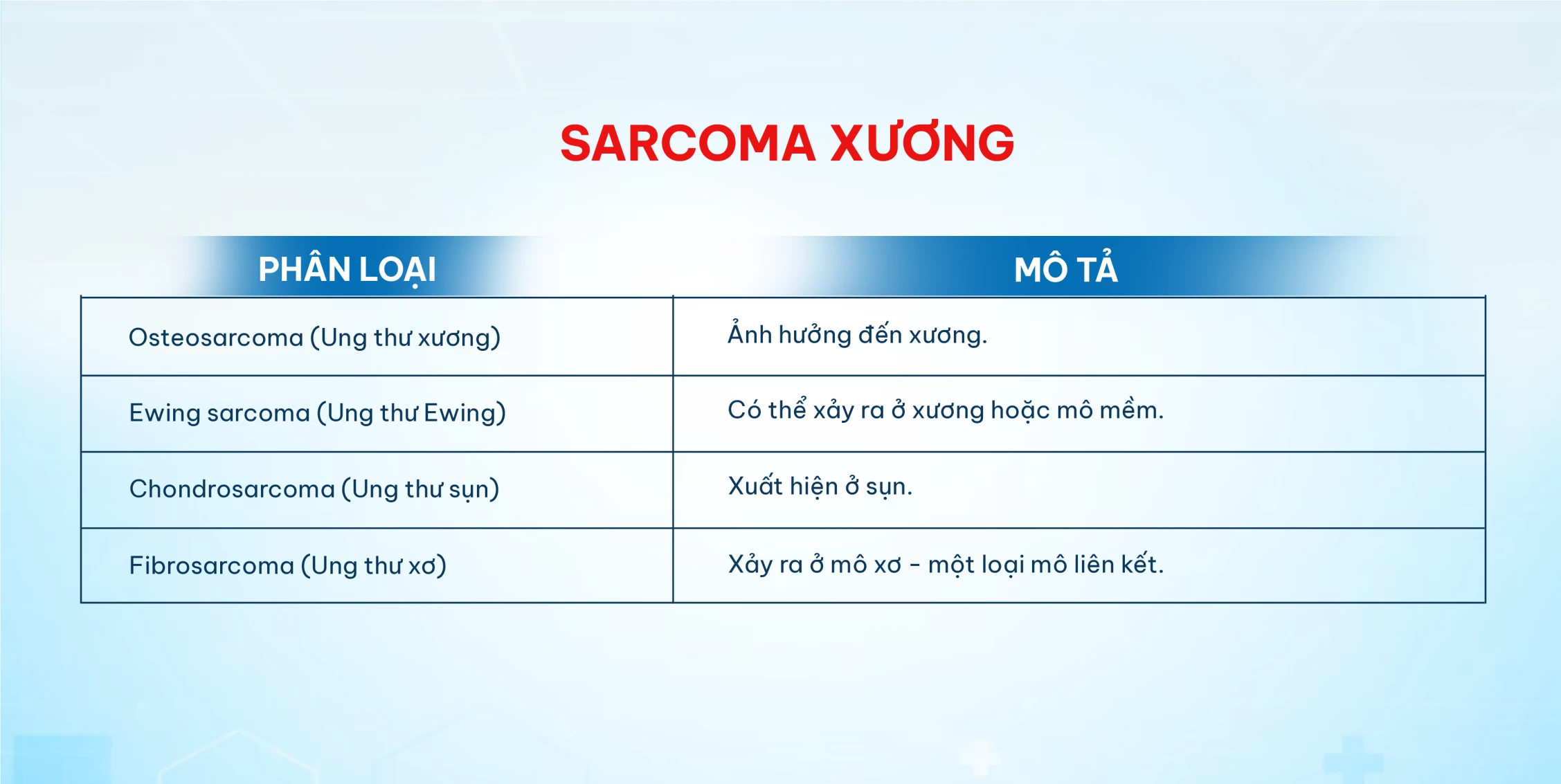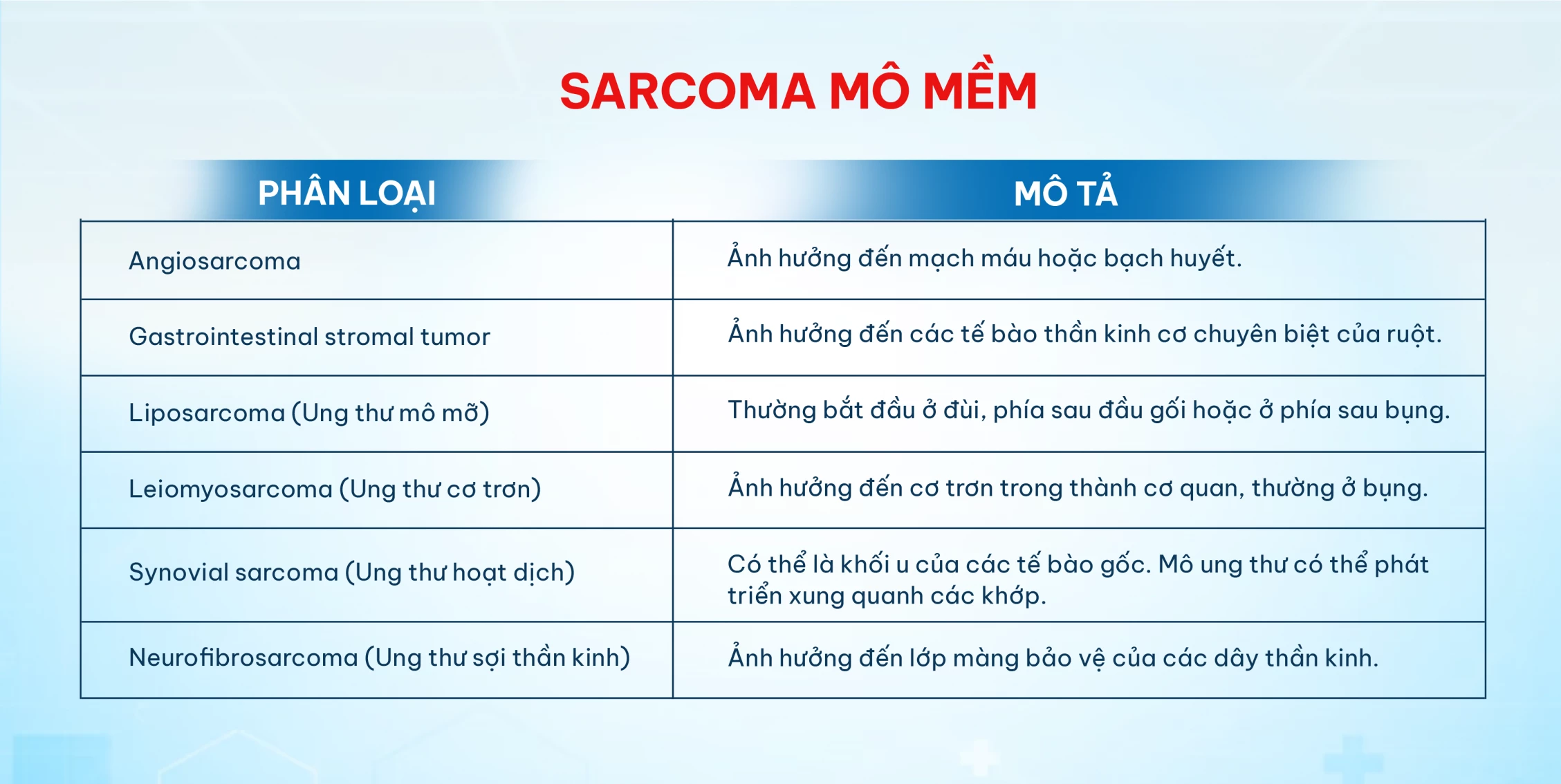 Sarcoma là một loại ung thư hiếm gặp nhưng nguy hiểm. Bệnh lý này có thể phát triển ở nhiều vị trí trong cơ thể, bao gồm xương và các mô mềm như mạch máu, dây thần kinh, cơ bắp, mô mỡ, dây chằng và các mô xung quanh khớp.
