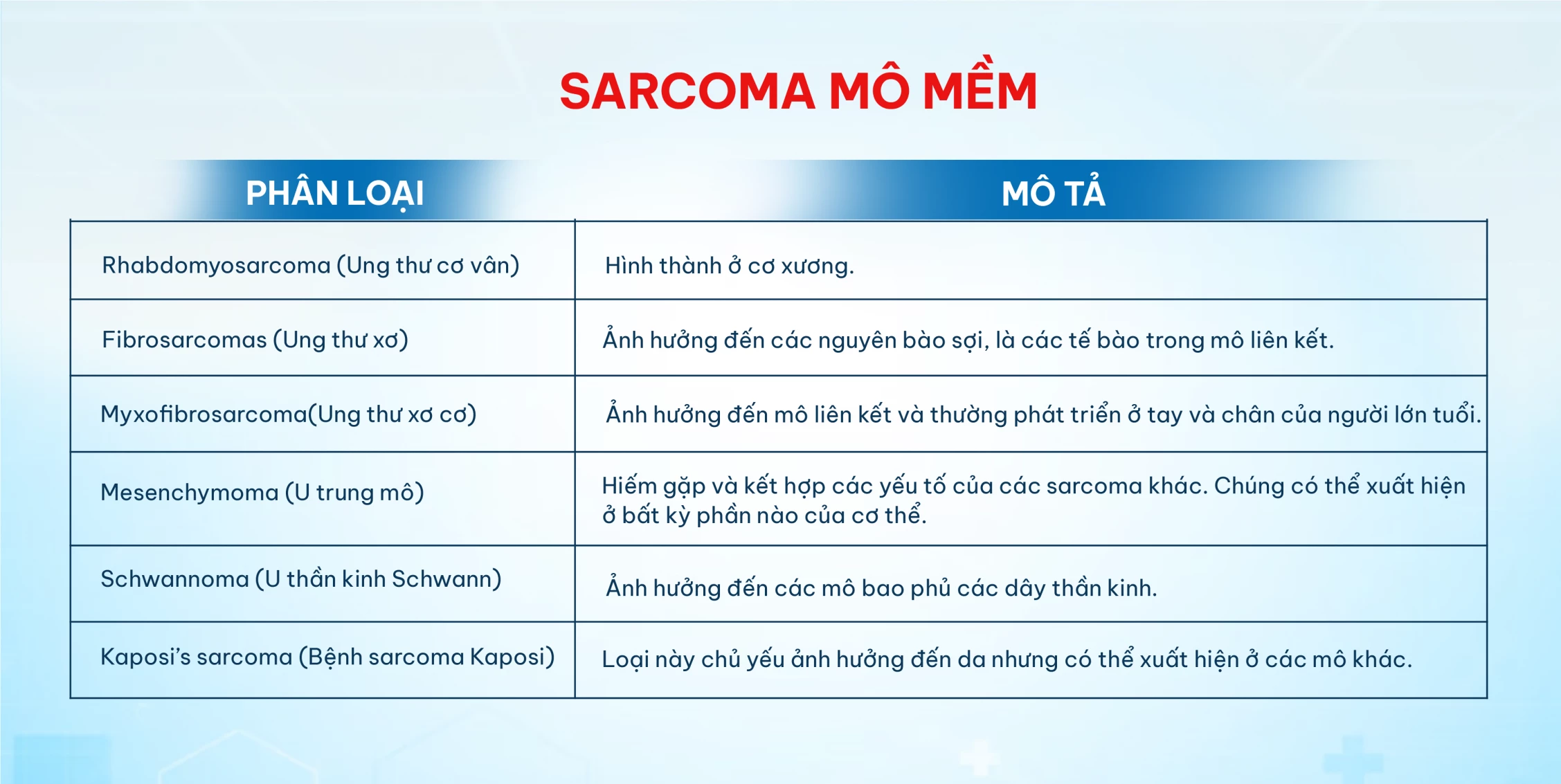 Theo ước tính, sarcoma có hơn 50 loại ung thư khác nhau và được chia thành 2 nhóm chính: Sarcoma mô mềm và sarcoma xương. Dưới đây là một số loại thường gặp nhất.