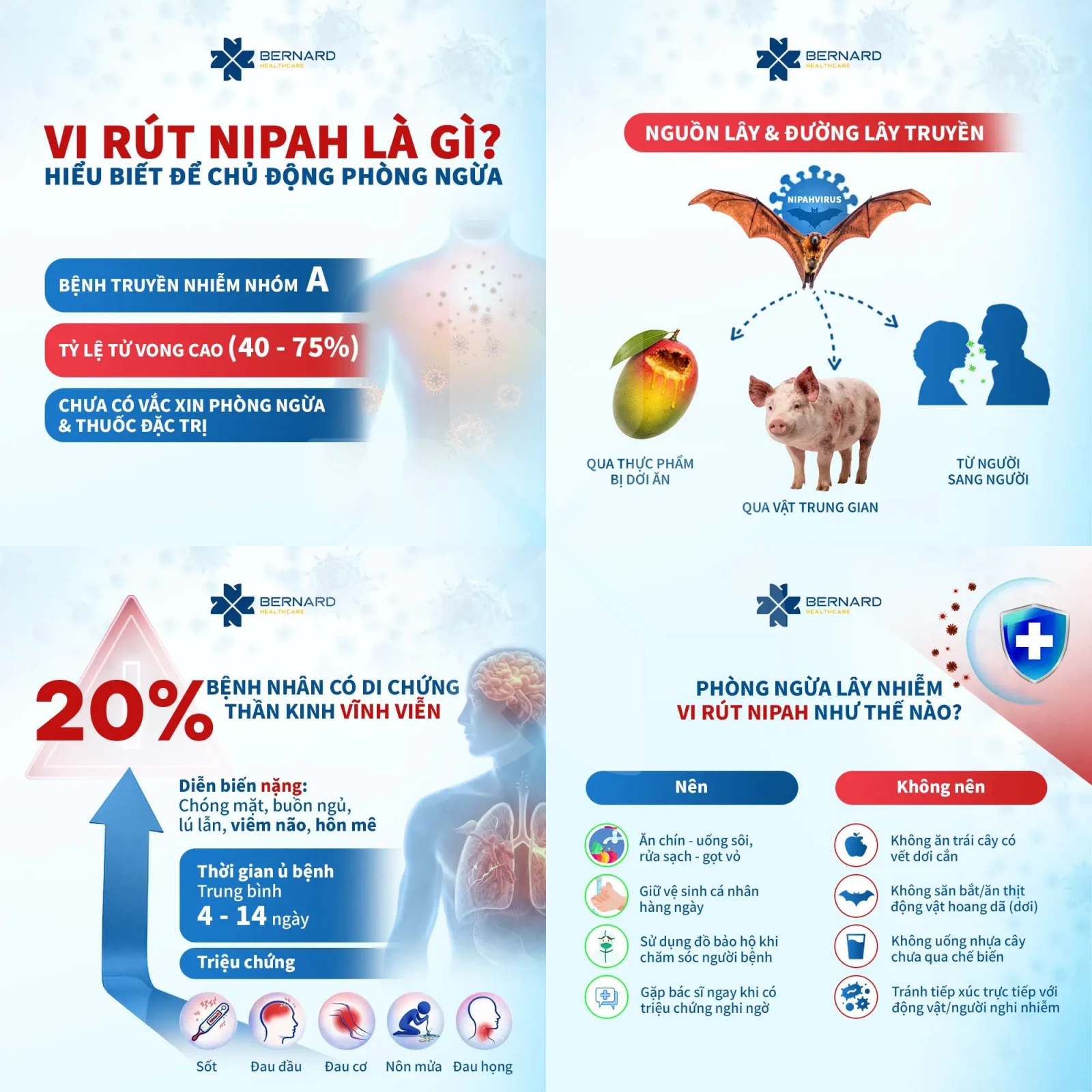 Vi rút Nipah là bệnh truyền nhiễm nhóm A có tỷ lệ tử vong cao. Tìm hiểu vi rút Nipah lây qua đâu, triệu chứng, mức độ nguy hiểm và cách phòng ngừa hiệu quả.